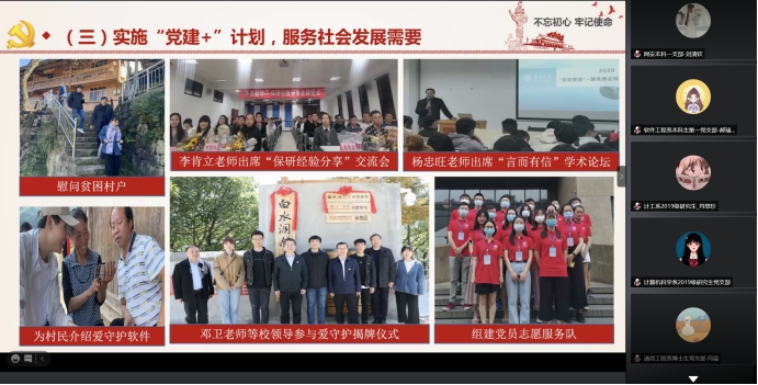 2020年是极不平凡的一年,虽然疫情造成了诸多不便,但各个党支部对于支部工作毫不懈怠,创办了丰富多彩的线上线下活动,例如计算机科学系博士生党支部利用超算平台,开发疫情监控与服务大数据智能分析系统,为政府新冠疫情防控提供信息和决策支持、通信工程系本科生第一党支部开展“街校共建”系列志愿服务活动,深入开展暑期“三下乡”社会实践等,都充分发挥了党支部的战斗堡垒作用。