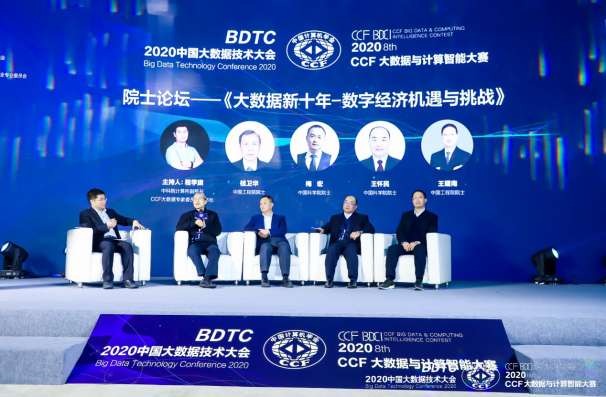 在以《大数据新十年-数字经济机遇与挑战》为主题的院士论坛上,主持人程学旗邀请梅宏、王怀民、桂卫华与王耀南四位院士分别就大数据过去十年的发展与成果,未来十年的机遇和挑战,以及数字经济分享了各自的观点。