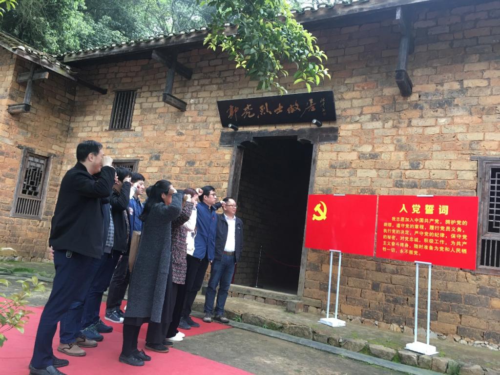 在郭亮纪念园内,全体党员在党支部书记聂承锋同志的带领下重温入党誓词,面对鲜红的党旗再次庄严宣誓;祭扫了郭亮烈士墓;参观了郭亮故居和郭亮烈士生平事迹陈列展。杨忠旺同志作为主讲人,介绍了郭亮烈士的生平、“郭亮带兵抓郭亮”群雕以及“甘愿为党献头颅”的英勇事迹。