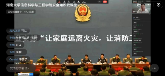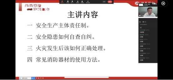 为进一步落实火灾防控工作,加强消防安全教育,提高教职员工消防安全意识和逃生自救能力,4月24日,yl6809永利YL集团以线上形式开展安全知识云课堂,特邀请湘安消防公益服务中心王松清教官进行授课。