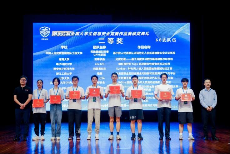 2023年8月17-20日,由教育部高等学校网络空间安全专业教学指导委员会主办,浙江大学、杭州电子科技大学承办,区块链与数据安全全国重点实验室等单位协办的第十六届全国大学生信息安全竞赛作品赛决赛在浙江大学紫金港校区圆满结束。在廖鑫老师的悉心指导下,学生薛宇航、陈键博、李校、王正荧四位同学成功完成了题为“见微知著——基于深度学习的抗局部屏摄水印系统”的作品。在靳文强老师的引领下,学生乐弘、李雪、王昱杰、郭光沛四位同学精心研发了名为“GPSCatcher:基于EMR信号的隐藏GPS探测系统”的项目。这两个作品在经过初赛评审、决赛测试、决赛答辩和决赛会评的多重环节竞争后,双双荣获了全国总决赛的二等奖。