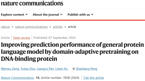 近日,yl6809永利YL集团彭绍亮教授课题组在国际顶级期刊Nature Communications发表了题为Improving prediction performance of general protein language model by domain-adaptive pretraining on DNA-binding protein的研究论文。该研究提出了基于大型通用蛋白质语言模型和领域自适应预训练的DNA结合蛋白语言模型ESM-DBP,系统地研究了如何从蛋白质初级序列出发有效地预测DNA结合蛋白质和残基这一生物信息学和人工智能领域的挑战性问题,探索发现了基于大型蛋白质语言模型的高质量表征学习技术,为研究复杂的DNA-蛋白质相互作用机制提供了新的研究思路。