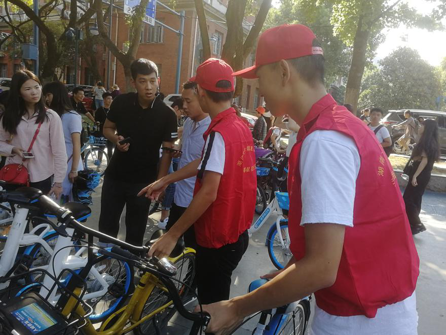 作为长沙著名景点之一,东方红广场上矗立着一尊伟大领袖毛主席的雕像,许多游客都来此合影,人流量可谓非常之大。国庆黄金周的东方红广场,更是人来人往,水泄不通。在这样的情况下,共享单车停放出现了混乱,地面上也是经常有被乱扔的垃圾;而志愿者的工作正是摆放自行车与捡拾垃圾,给每一个来到这里的游客留下一个好印象。活动的内容听起来挺简单,但实际上却不那么容易,刚摆整齐的自行车一转眼就被停下的车打乱了秩序,刚捡起了垃圾的地面又被新的垃圾污染。志愿者们没有抱怨,而是选择用他们的耐心劝告与反复整理、捡拾来诠释着“志愿精神”。