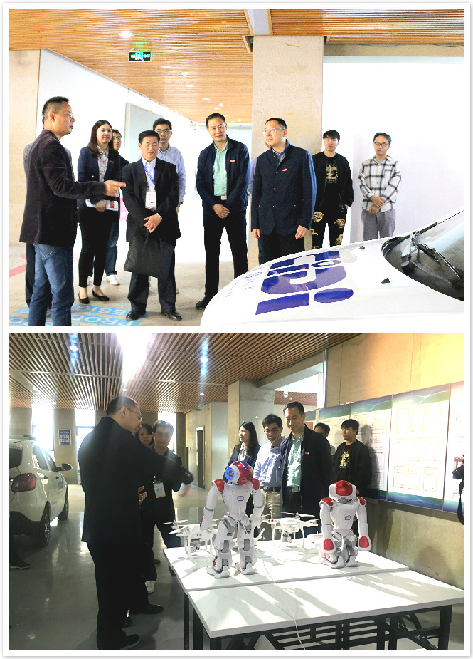 专家在学院领导陪同下还参观了学院文化展厅、学生毕业设计作品墙,参观了智能汽车、无人机、机器人等实践创新平台,向专家展示了各类新技术在实践平台上的应用与教学方案,以“人脸检测”这一技术为例,演示了“人脸检测”这一技术在各个平台中的应用——在微信与移动端APP上,通过实现“人脸检测”,实现了智能考勤与签到;NAO机器人平台实现的“人脸检测”功能能够让机器人增加“智能服务”功能;而无人机平台上添加有关“人脸检测”的代码,能够在群体性事件时快速发现重点关注人员,提高警方处置群体性事件的效率,充分体现学院注重 “做中学”来提高学生实践创新能力。