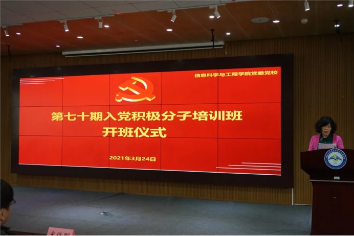 3月24日中午,中共yl6809永利YL集团分党校第70期入党积极分子培训班开班仪式于信息院401报告厅举行。学院党委书记杨忠旺老师、党委副书记、纪委书记骆嘉伟老师、副处级组织员张国田老师、学工办主任、组织干事宋任刚老师、学生党建兼干张雅静老师出席仪式。仪式由骆嘉伟老师主持。