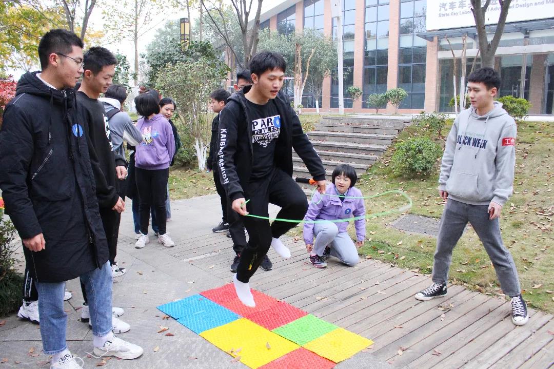 此关卡一共分为四个部分:双脚跳绳5下、单脚跳绳3下、平板支撑15秒以及一名成员背另一名成员站立10秒。值得注意的是,以上四个部分都需要在指压板上进行。每个小组的五名成员都需要参与其中,各自选择一个部分进行。这一关主要为了通过一点点身体上的不适让同学们感受到当年红军在敌人的围追堵截下冒着巨大的危险与牺牲,如何克服痛苦、成功突围,为日后保存下革命的火种。