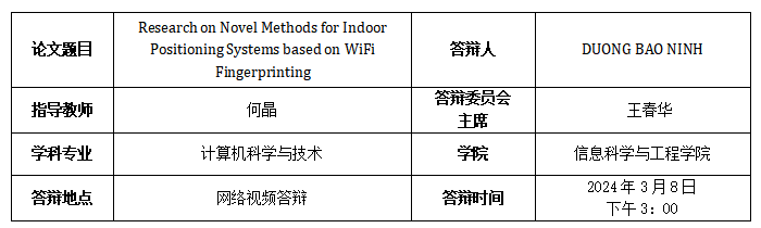 [3]. Duong Bao Ninh, Jing He, Luong Nguyen Thi, and Khanh Nguyen-Huu, “Analysis of Distance Measures for WiFi-based Indoor Positioning in Different Settings,” 2022 2nd International Conference on Innovative Research in Applied Science, Engineering and Technology (IRASET), pp. 1-7, Mar. 2022.