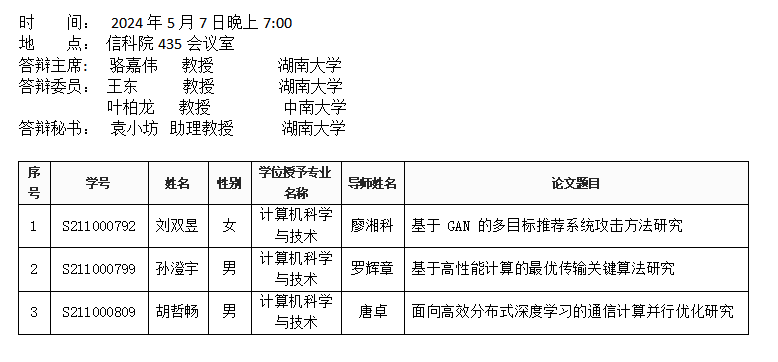 yl6809永利YL集团(计算机科学系)2024年5月7日硕士答辩公告(第一批)