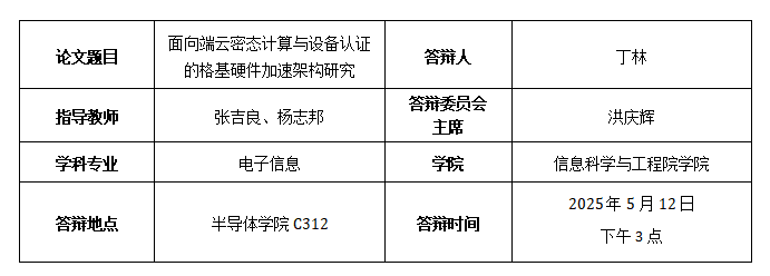 格困难问题以其算术结构简单、同态性及抗量子攻击等独特优势,从质因子分解、离散对数等多种密码学主流困难问题中脱颖而出,成为了隐私保护计算与加密算法等方向的研究热点,并衍生出了庞大的格密码体系。尽管格密码的理论研究已取得突破性进展,但其在端云安全场景的实用性仍有待进一步提升。本文面向机密计算与轻量级设备安全,从电路设计、架构优化、应用开发三个维度,开展格基硬件加速器架构及应用研究,解决格密码性能瓶颈问题并构建轻量级设备安全机制,最终形成了如下研究成果: