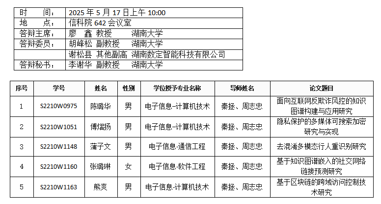 yl6809永利YL集团(计算机科学系)2025年5月21日硕士答辩公告