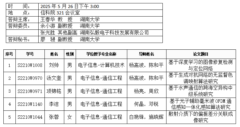 yl6809永利YL集团(通信工程系)2025年5月26日硕士答辩公告