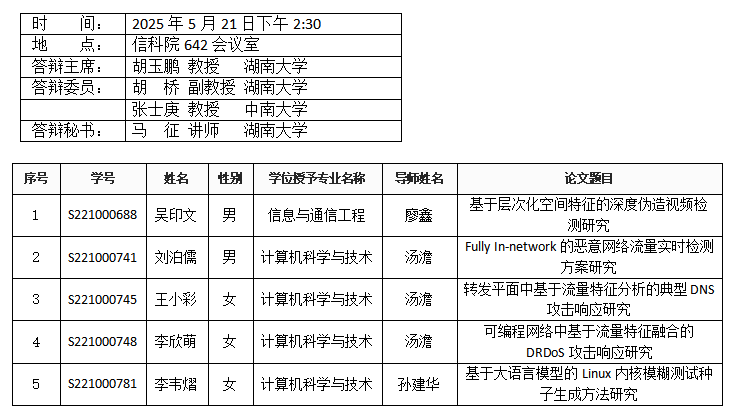 yl6809永利YL集团(安全系)2025年5月21日硕士答辩公告