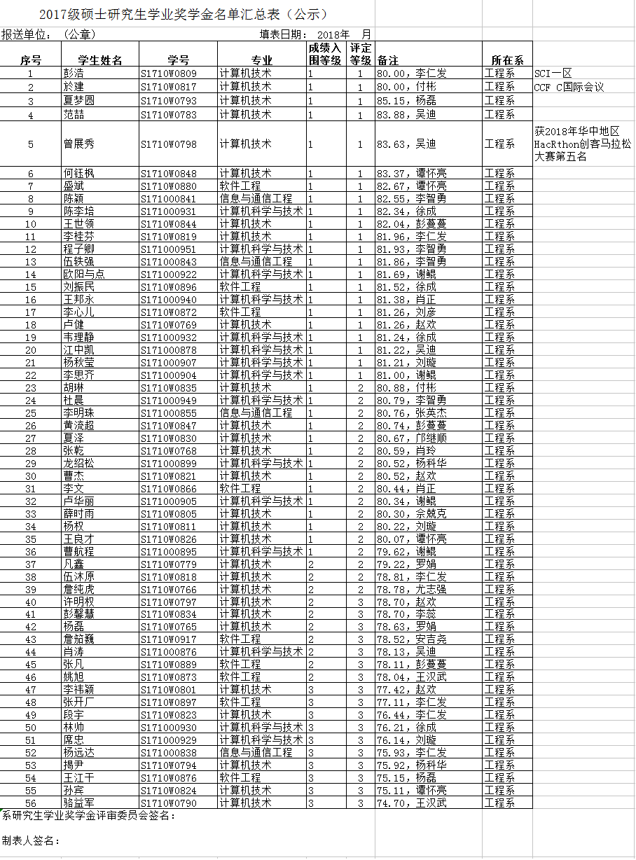 计算机工程系研究生2016 2017两个年级奖学金评定结果现在公示如下,如有不同意见,请于2018年10月31日前10:00以邮件返馈,邮箱地址为:1033031221@qq.com (刘老师)。谢谢大家